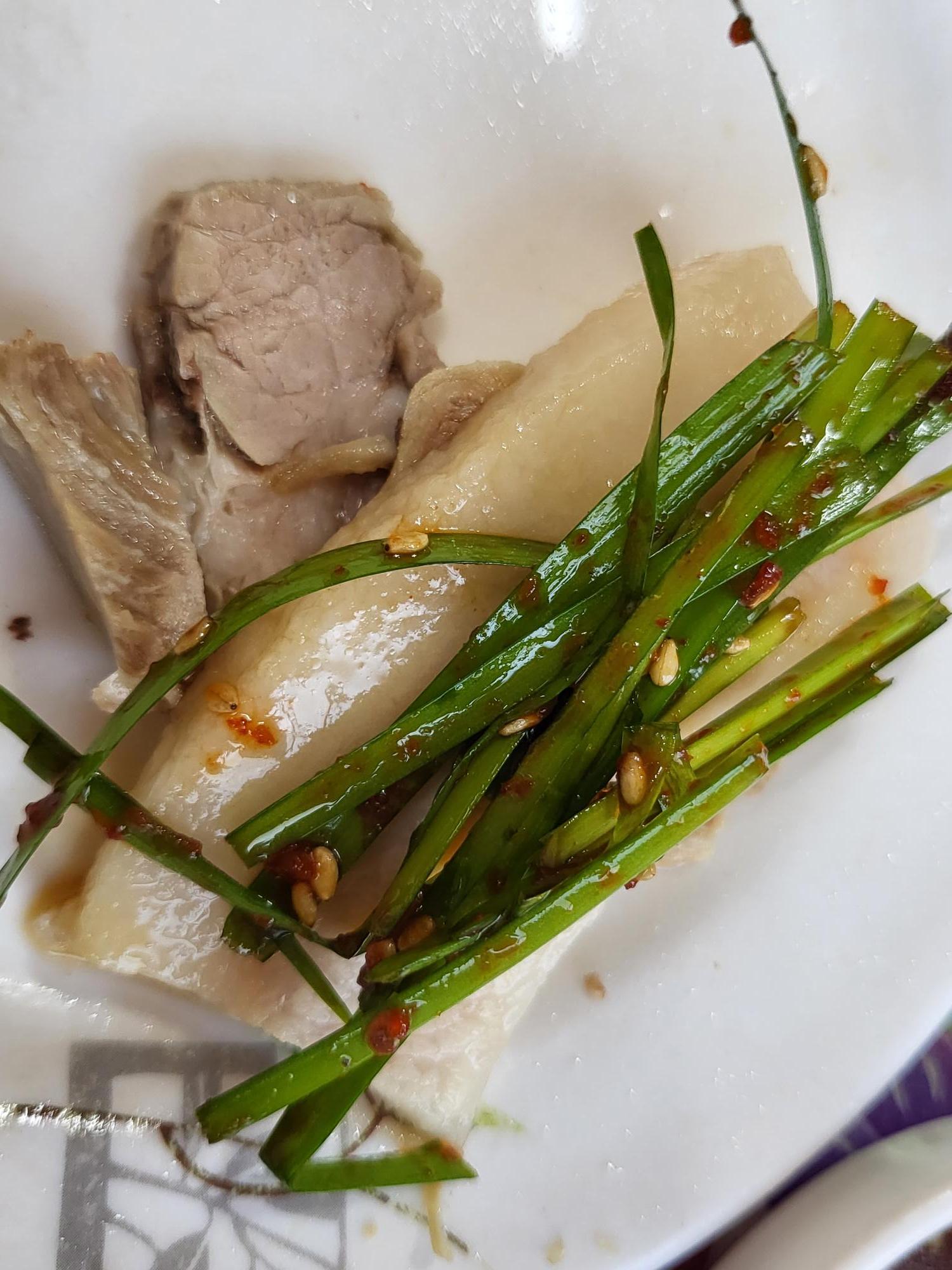 같이 나오는 새우젓, 쌈장, 와사비 간장 어느것도 하나 빠지지않고 맛있네요. 이 부추양념은 정말 너무너무 맛있어요. 국밥에 넣어서도 먹고 이렇게 고기와 싸서 먹기도 합니다.
