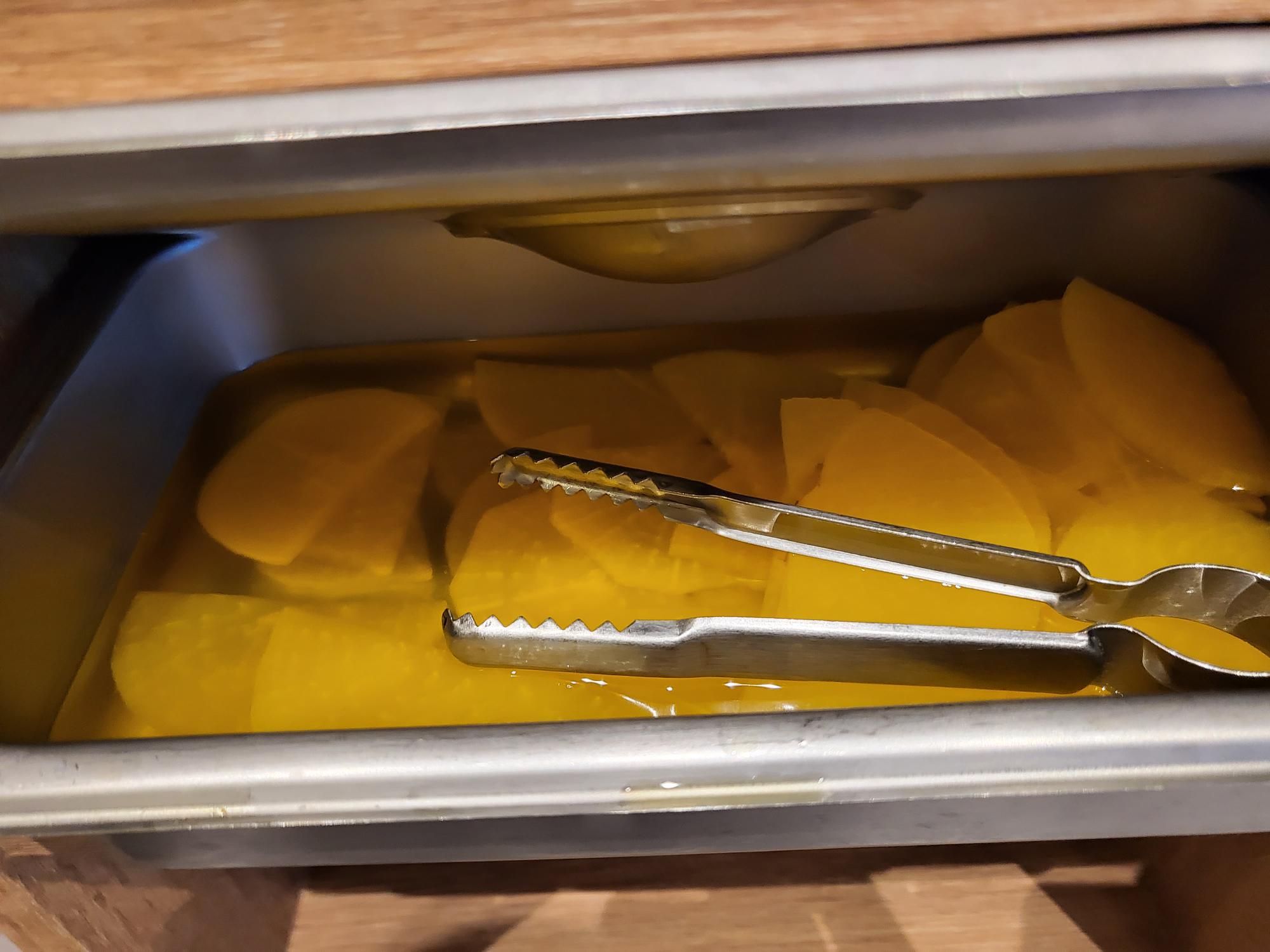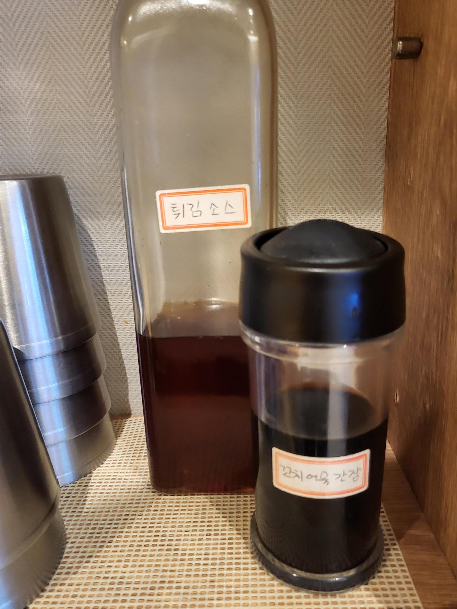약간 가파른 계단을 올라가면 이렇게 몇개의 테이블과 정수기, 셀프바가 있어요. 단무지, 소스 등을 가져다가 먹으면 되요.