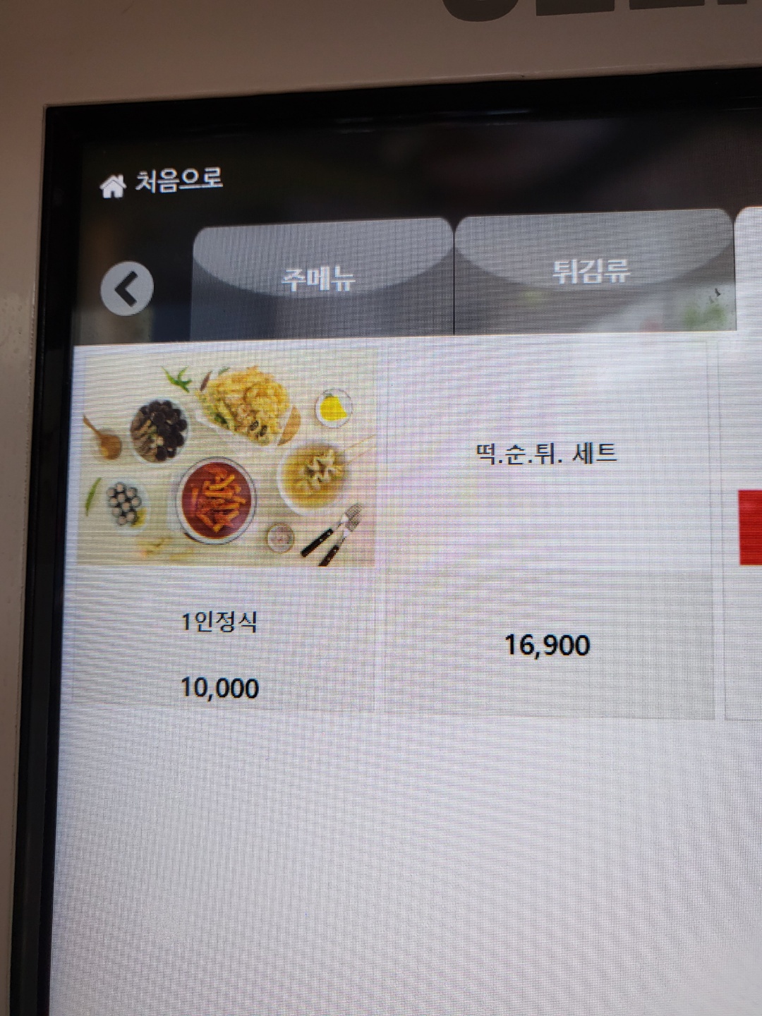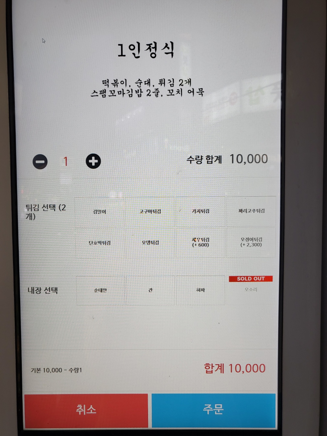 무인주문기에서 1인정식을 시켜봅니다. 튀김 중 2 가지를 선택할 수 있고 순대도 고를수 있네요. 바쁜 매장에서 이런 디테일한 주문 좋은거 같아요.