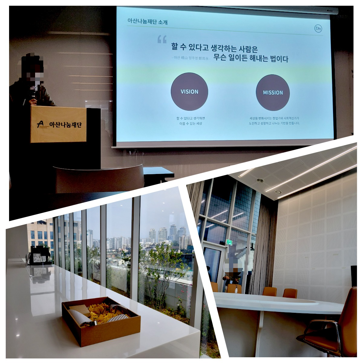 어떻게 Maru 180 과 360 이 탄생하게 되었는지 아산나눔재단에서는 창업자들을 위해 어떤 프로그램들을 운영중인지도 듣고 뷰가 정말 판타스튁한 옥상부터 그 뷰가 고스란히 보이는 모던한 휴게실과 회의실을 구경했어요.