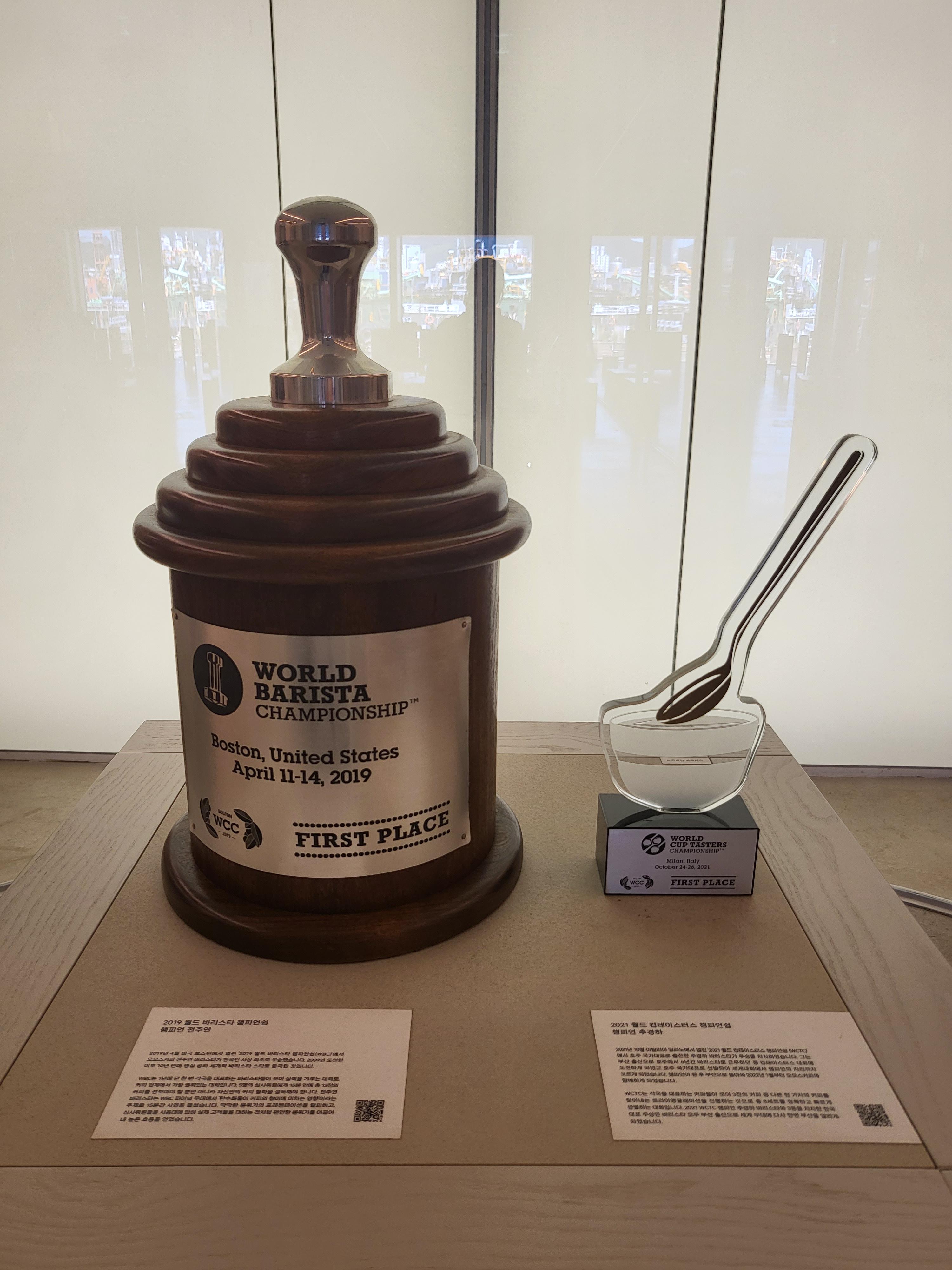 넓은 공간에 층고도 아주 높고 로스팅 기계와 여러종류의 커피제품도 많아서 커피 전시관에 온듯한 느낌이 들어요. 구경하는 재미가 쏠쏠하네요. 월드바리스타 챔피언 상패도 있네요. ^^