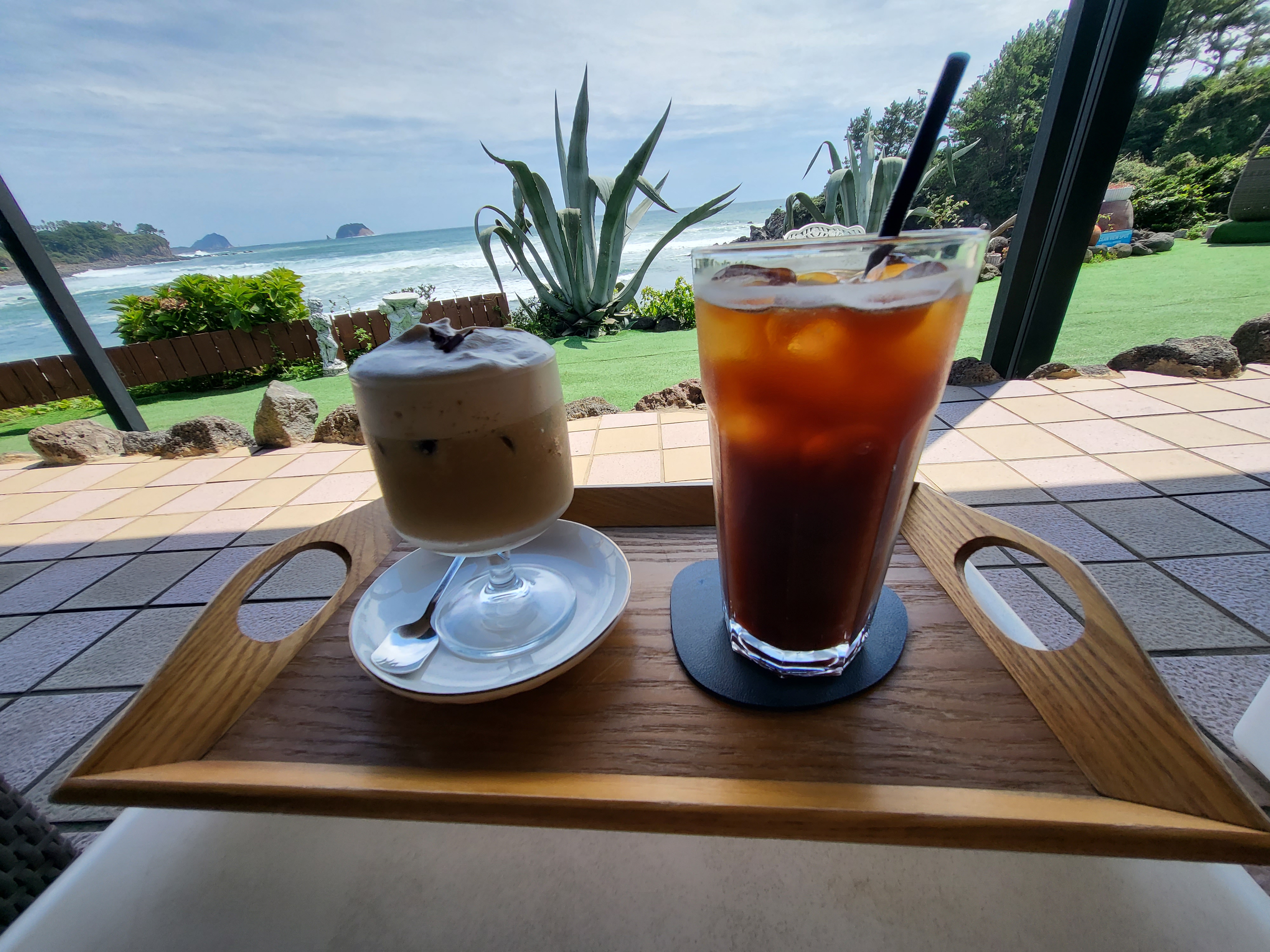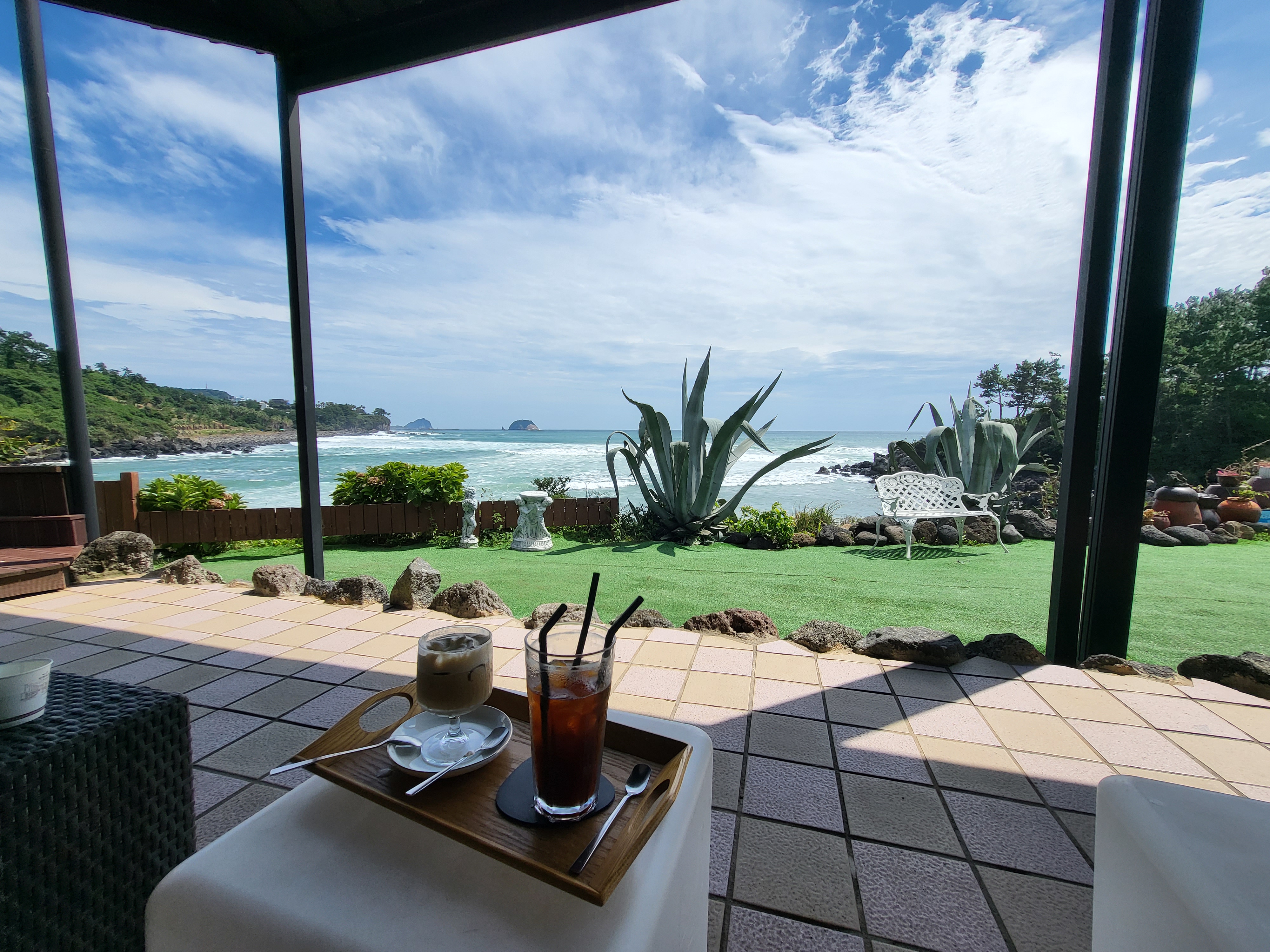 이렇게 오른쪽으로 오션뷰 테라스와 뒷편으로도 또 야외공간이 있어요. 코코는 이미 자리 잡으러 먼저 가네요. ㅎ 오션뷰 테라스에 앉아있으면 좋은데 주문을 하고 입구쪽이나 뒷편 문쪽으로 돌아서만 들어갈 수 있어서 좀 먼 감이 있더라고요.