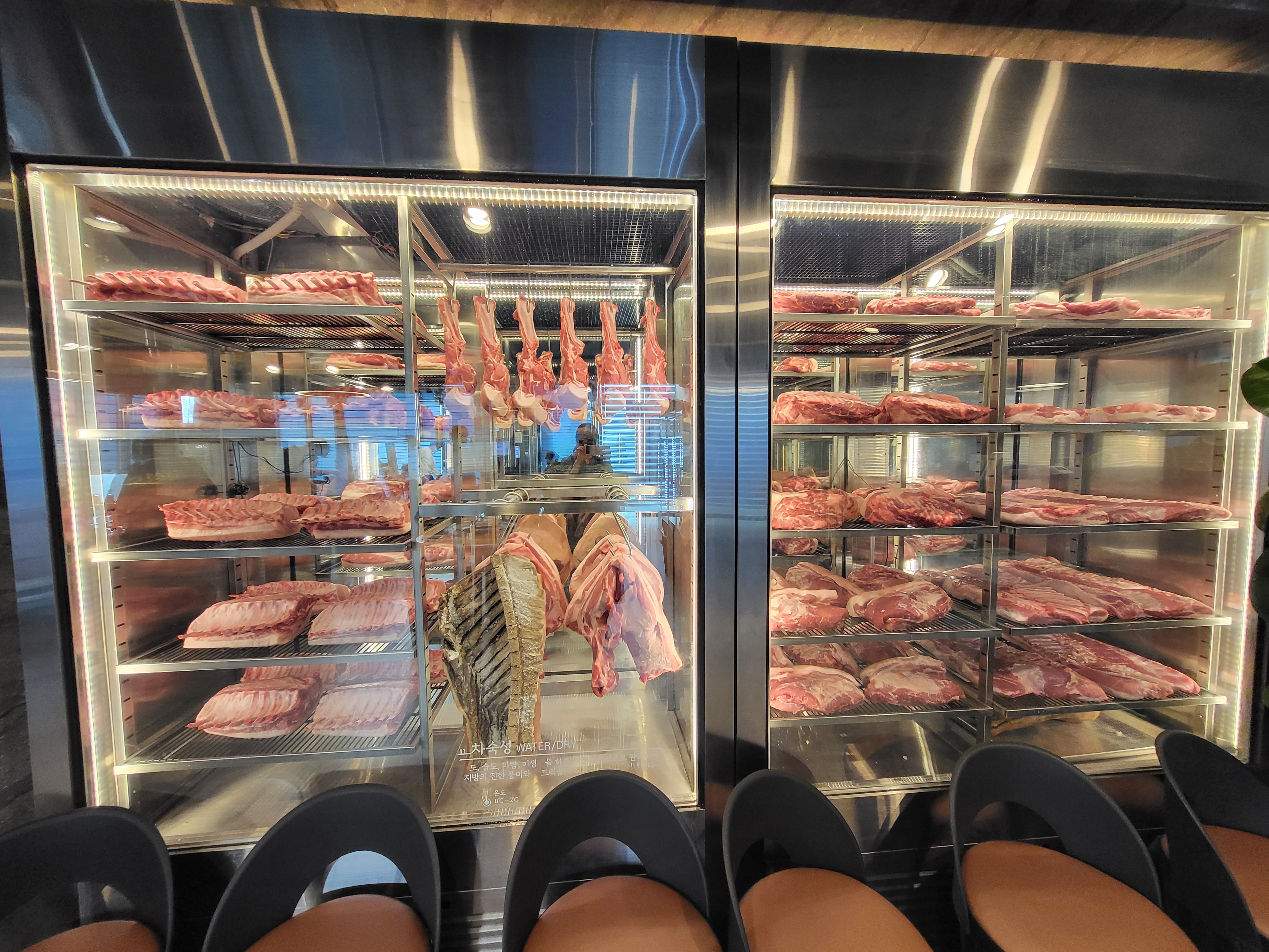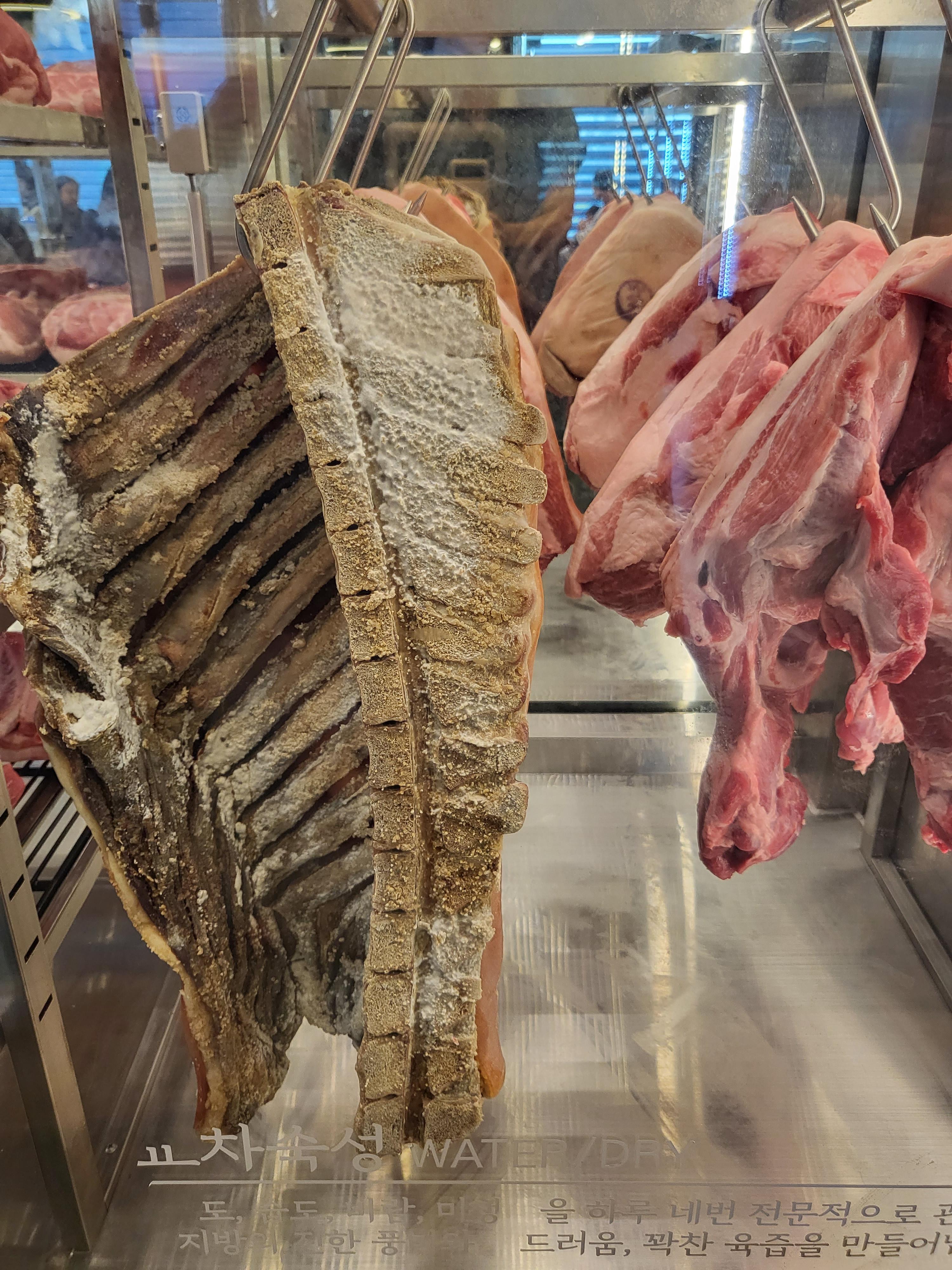 입구쪽에 대기자들을 위한 의자들이 있고 그 뒤엔 무시무시한 고기보관 냉장고가 있네요. 갈색으로 보이는 부분이 숙성을 시킨 돼지고기인것 같았어요.