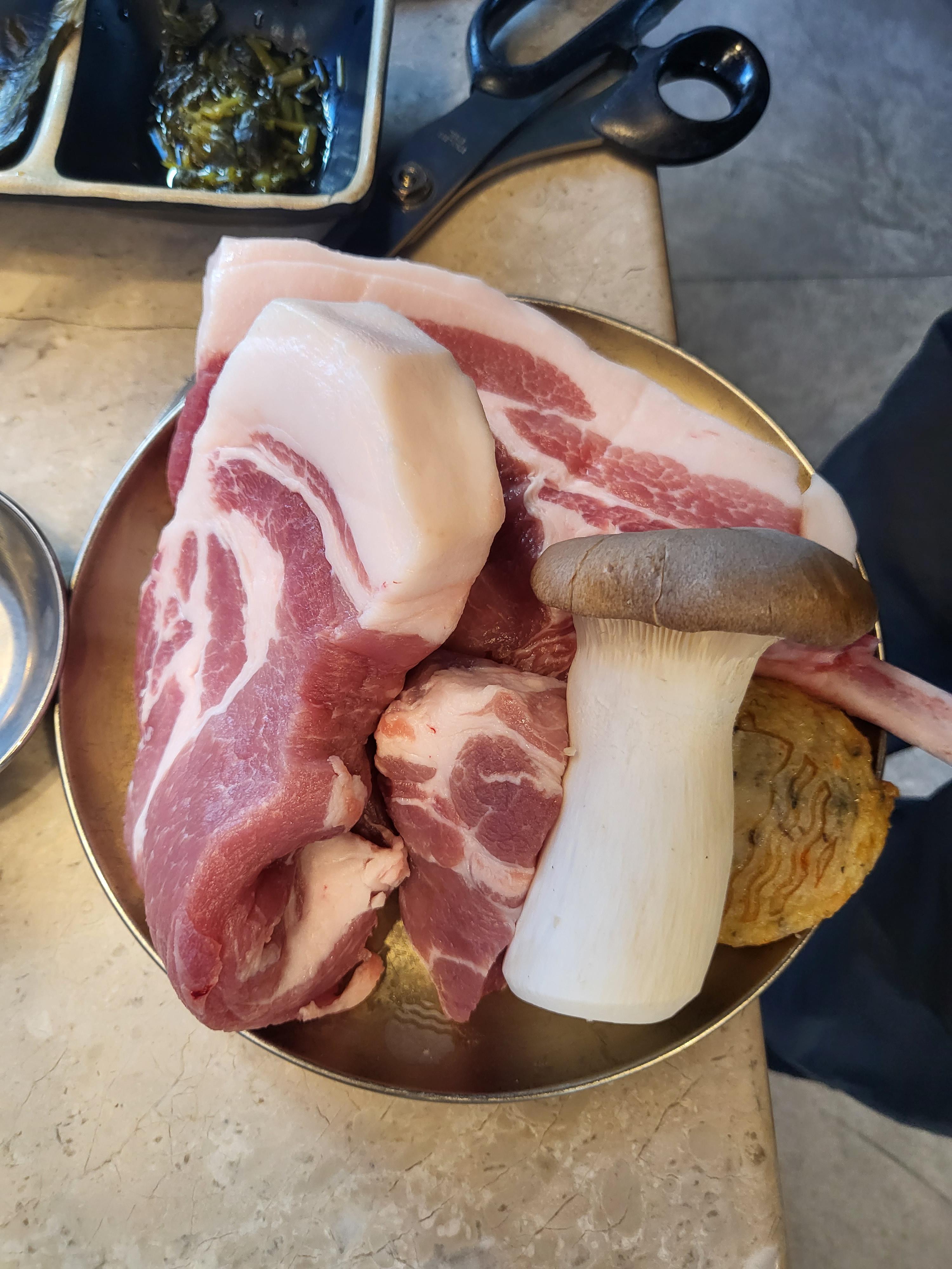 가깝게 보니 약간 징그럽긴 한데 신기했어요. 상대적으로 옆에 있는 돼지고기들이 정말! 신선해보였어요.