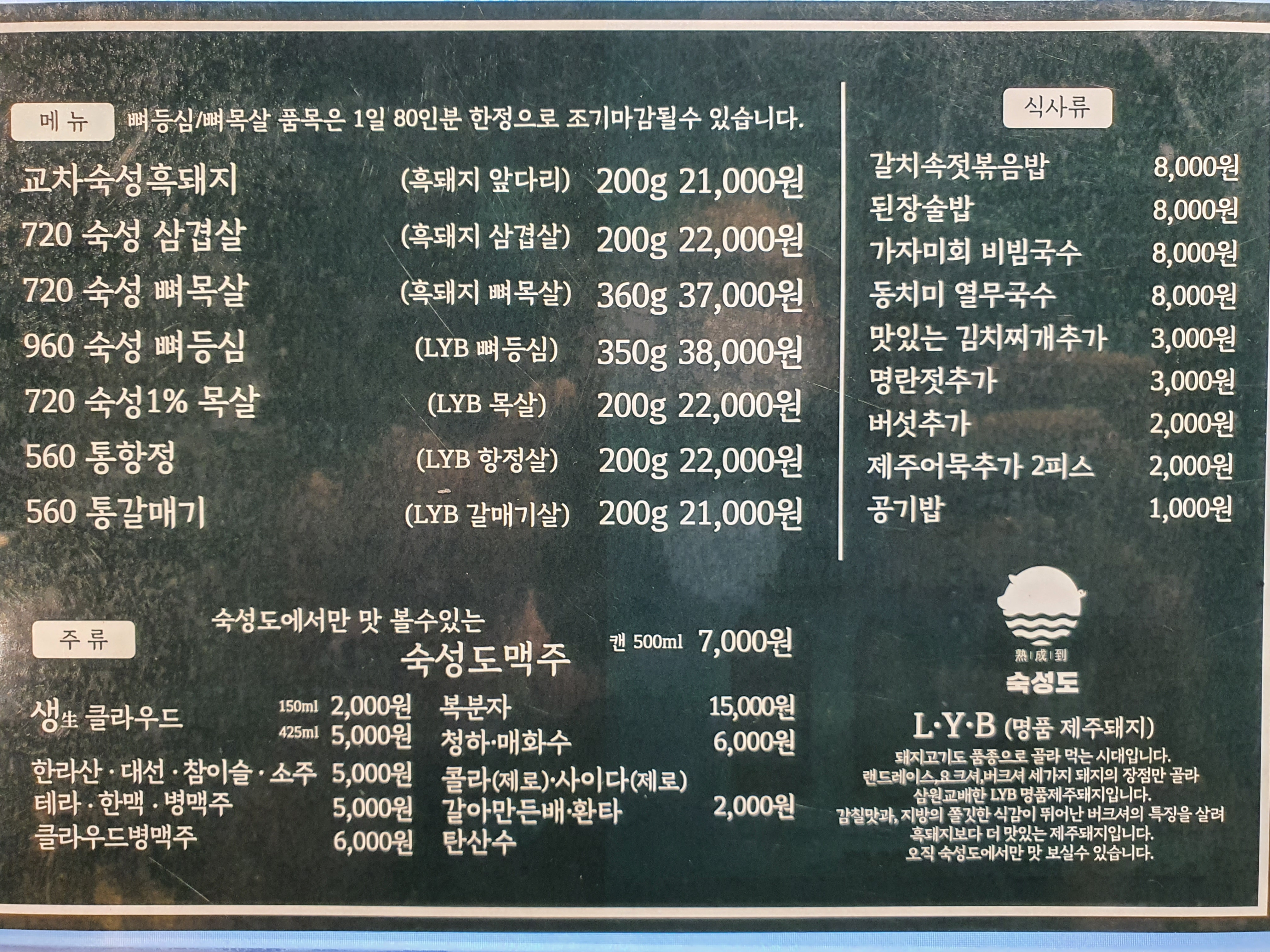 제주도에 방문하면 꼭 맛봐야 하는게 흑돼지죠! 어차피 먹고 와야 하는 비싼 돼지고기라면 줄이 길더라도 맛집으로 소문난 숙성도에 가보자 결정했어요. 함덕 근처에 있었기에 함덕점으로 갔어요. 위치는 함덕해수욕장에서 가까운데 길도 좁고 지하 주차공간도 적어서 해수욕장 앞에 주차를 하고 걸어오는게 좋아요. 저는 운 좋게 건물 주차장에 자리가 있었는데 주차 공간이 작아서 넣고 빼는데 약간 애 먹었어요. 주차가 서투르신 분들은 해수욕장 주차장 추천드려요!