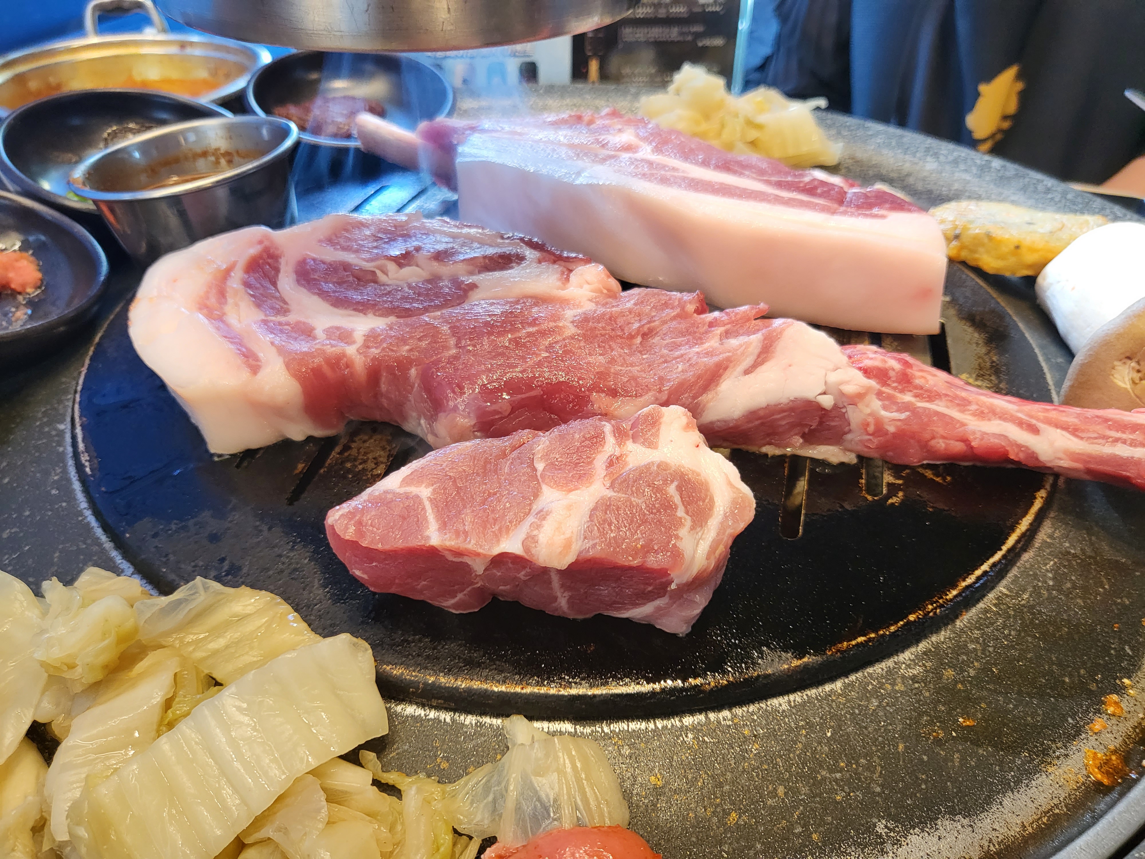 숙성도의 특징은 고기 구워주는 알바분들이 따로 있다는 점이에요. 실제 트레이닝도 많이 받은 분들이라는데 손놀림이 아주 전문가스러웠어요. 고기를 구우면서 설명도 열심히 해주 는데 숙성된 고기라 약간 핑크빛이 보여도 먹어도 된다고 했던게 인상깊네요. 돼지고기는 원래 바짝 구워서 먹어야 안전하다고 알고 있었는데요.