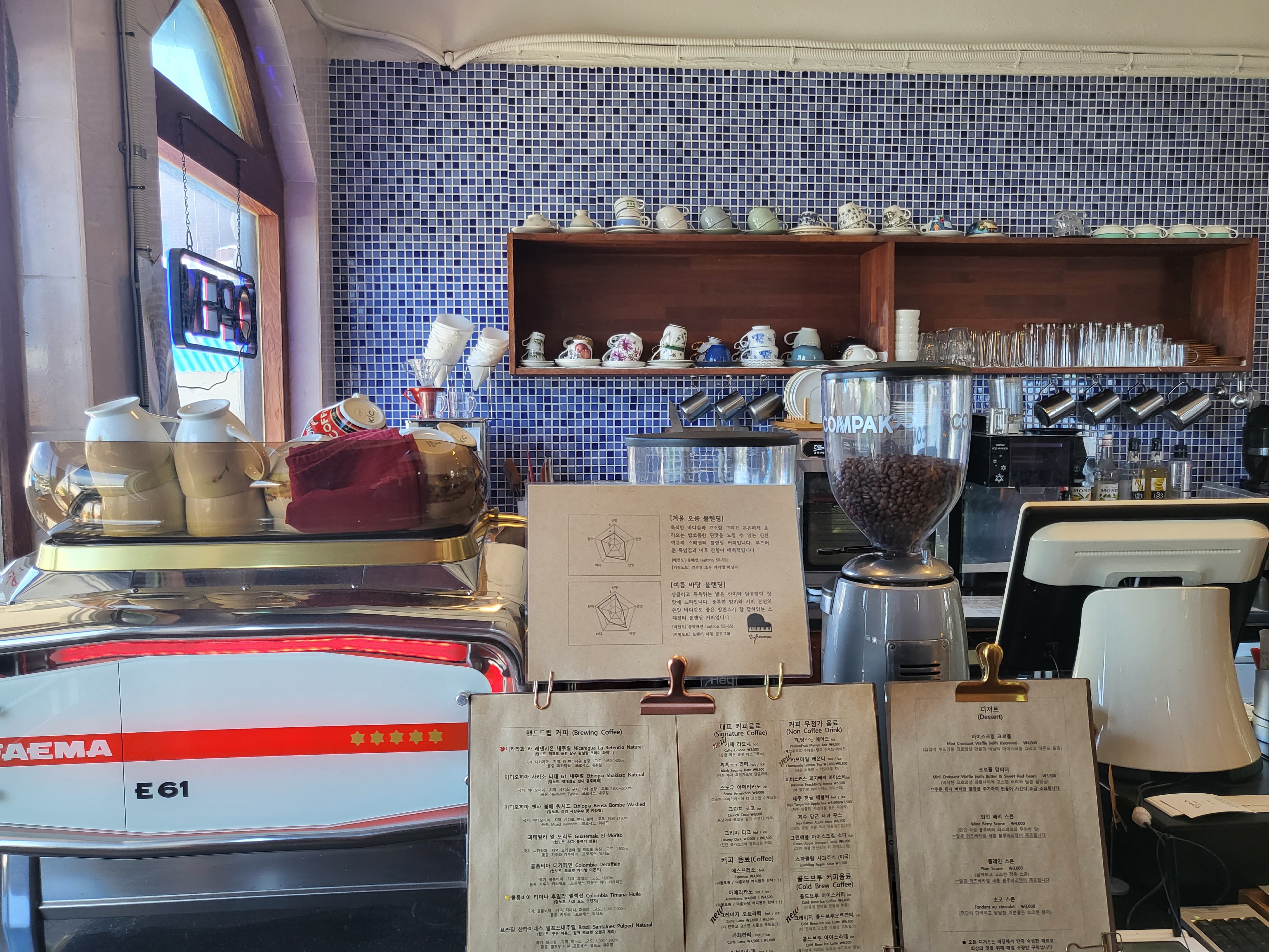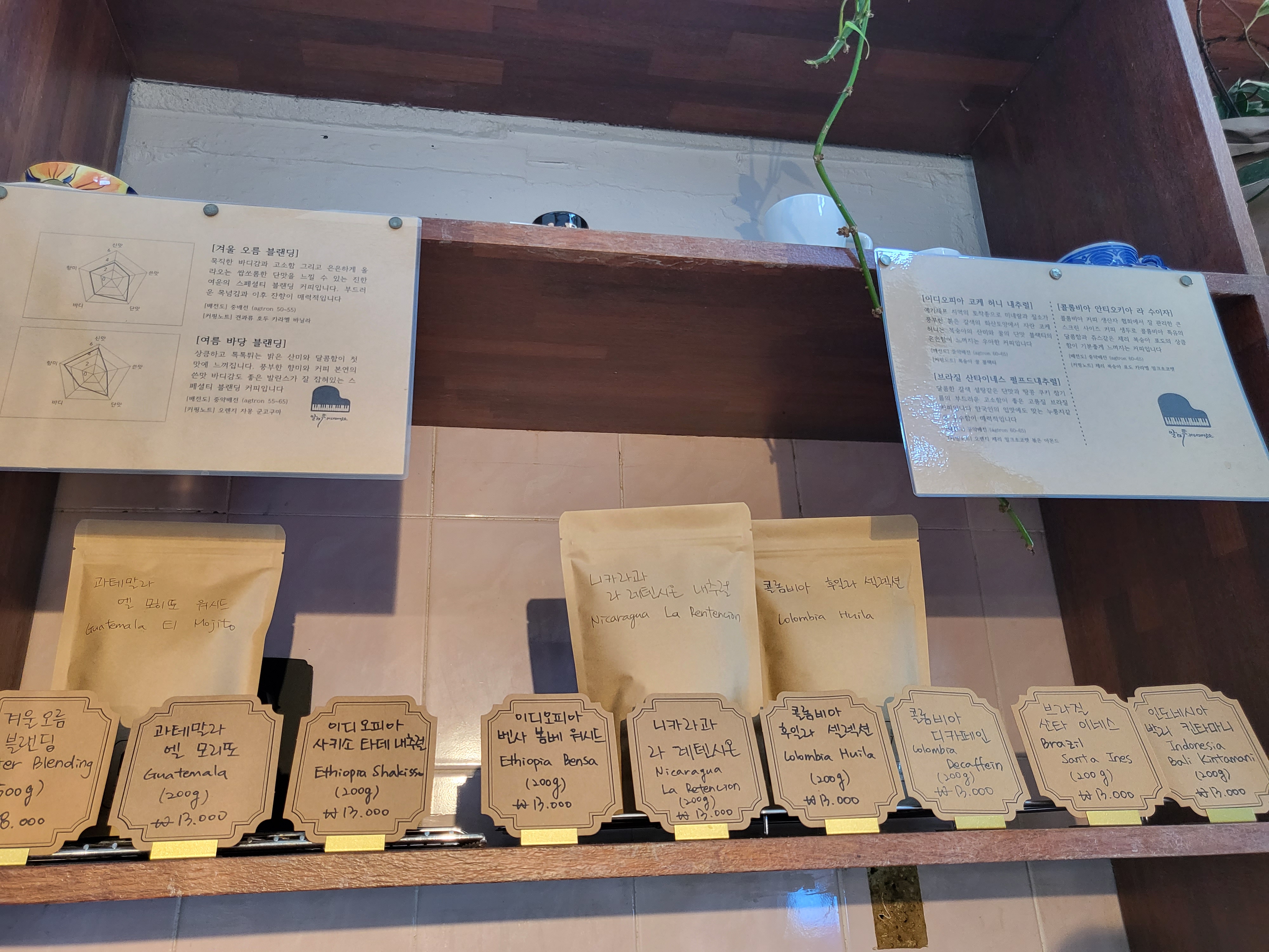 커피숍을 가면 커피기계부터 보고 들어가는데요. 로스팅도 직접 하시고 이 정도 기계면 맛도 좋을거라 기대합니다. 직접 로스팅한 원두도 팔고 있더라고요.