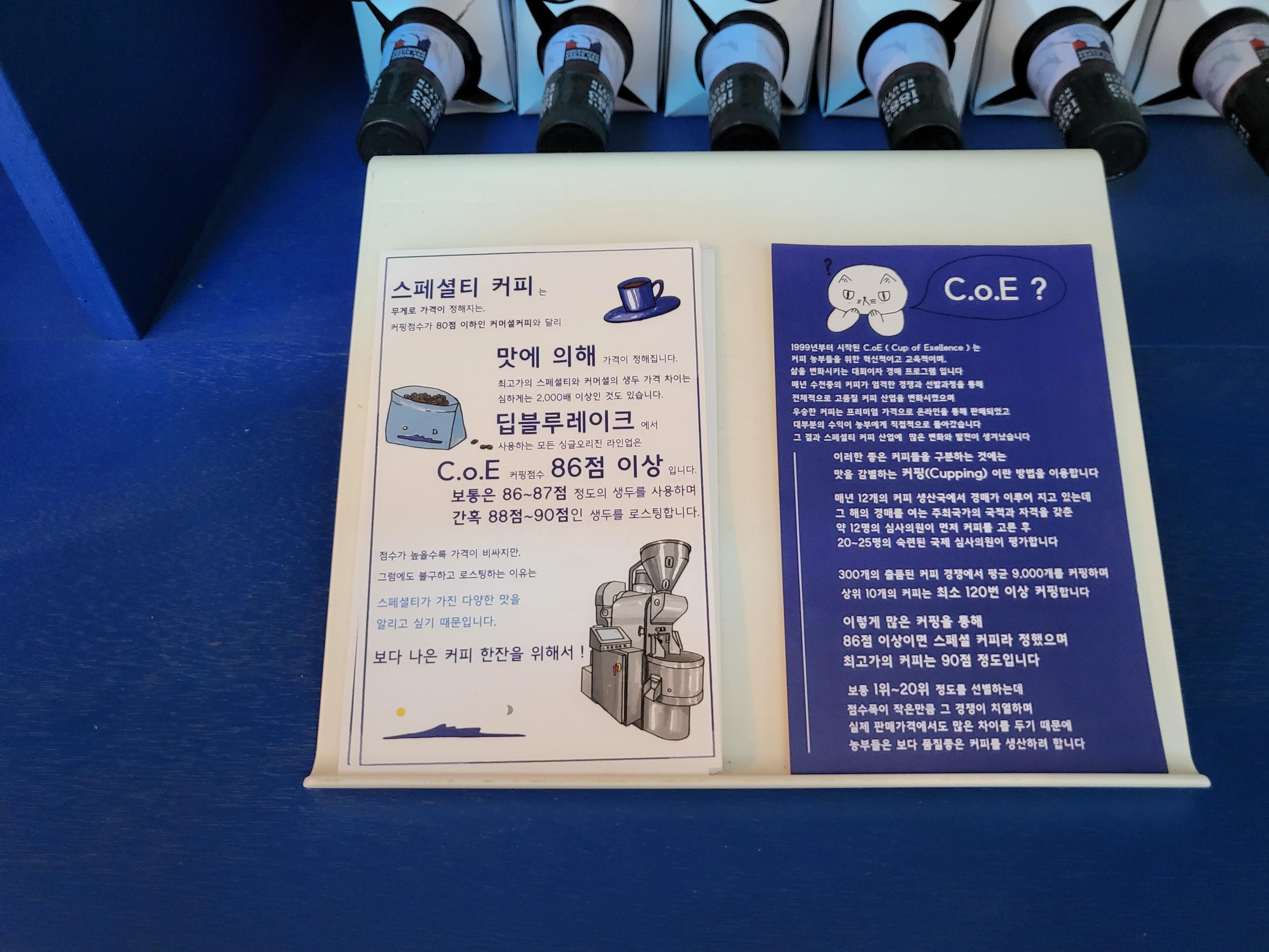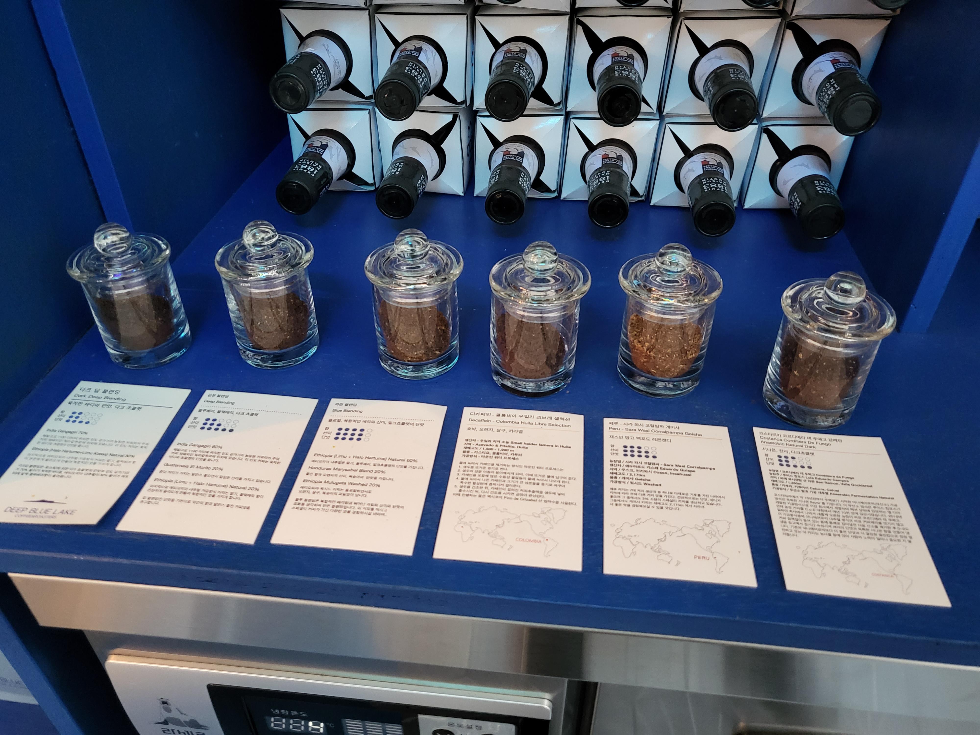 주문도 했으니 숍을 한번 둘러봅니다. 윗층에 테이블 공간이 더 있는데 그 아래 이렇게 원두를 판매하고 있어요. 약간 커피 박물관처럼 전시를 해놓고 설명도 있어서 둘러보는 재미가 있어요.