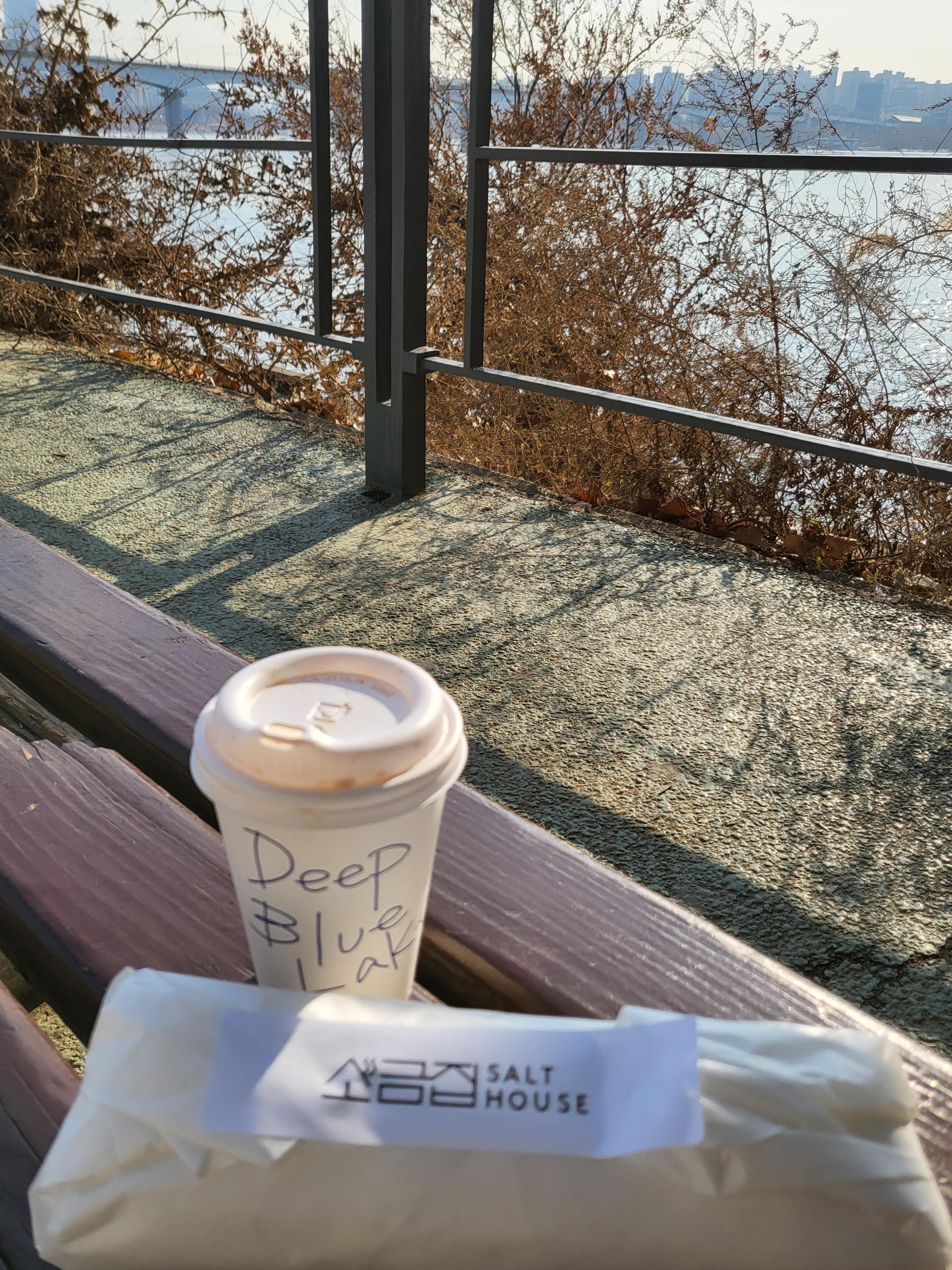 테이크아웃을 해서 근처 소금집 잠봉뵈르와 함께 한강에 가서 얌얌~ 늘 그렇지만 플랫화이트 주문을 했는데 역시 로스팅을 직접 하는 커피숍 답게 신선한 풍미가 느껴집니다. 굉장히 만족스러운 커피였어요. ^^