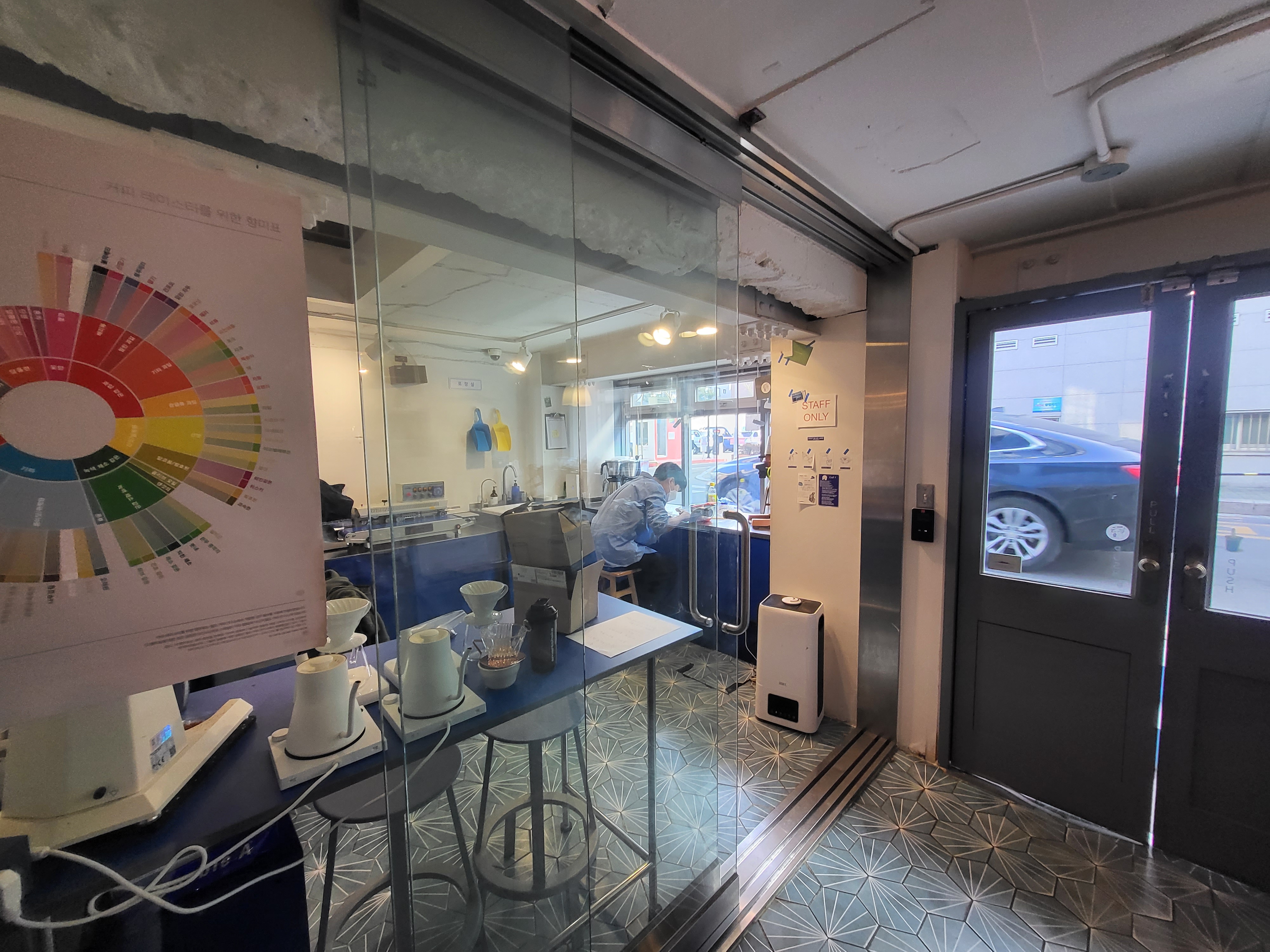 들어가자마자 오른쪽엔 로스팅, 패키지 하는 공간이 있어요. 확 트여있고 연구소 같이 깔끔한 분위기 너무 좋네요.
